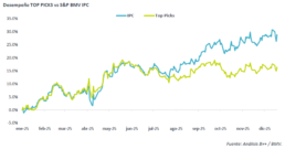 - El retorno del índice fue beneficiado por sus valuaciones atractivas y sólidos fundamentales, mientras que en el mercado estadounidense predominó la incertidumbre y los múltiplos encarecidos, generando cierta preferencia por los activos mexicanos.