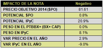 El día de hoy Grupo Televisa (Tlevisa) envió un comunicado a la BMV respecto de las resoluciones y acciones emprendidas por el Instituto Federal de Telecomunicaciones (IFT) que afectan directamente a la compañía al declarar a la empresa como un Agente Económico Preponderante en el sector de radiodifusión. Cabe recordar que un Agente Económico Preponderante es aquella compañía que cuenta con una participación mayor al 50% ya sea en términos de usuarios, suscriptores, infraestructura o tráfico. Recordamos que Tlevisa NO forma parte de nuestro Portafolio BX+. El PO’14 promedio de consenso es de P$ 81.61 lo que implica un potencial de 0.8% vs 20.9% del IPyC.