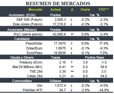 • Bonos: La curva de futuros de EUA registra movimientos positivos en todos los nodos, en promedio de 4pb. El bono del tesoro de 10 años cayó, impulsando su rendimiento a un nivel cercano al nivel mínimo en seis semanas.