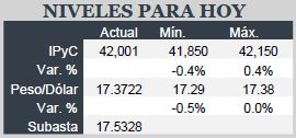 • Bonos: A dos días de la decisión de la Fed, prevemos alta volatilidad en el mercado de renta fija, por lo que la apertura negativa tiene alta posibilidad de prolongarse durante la jornada. Los cambios promedio de 4 puntos base que registran los nodos de corto plazo y la carencia de movimientos en los de largo plazo será el patrón que observemos los siguientes días.
