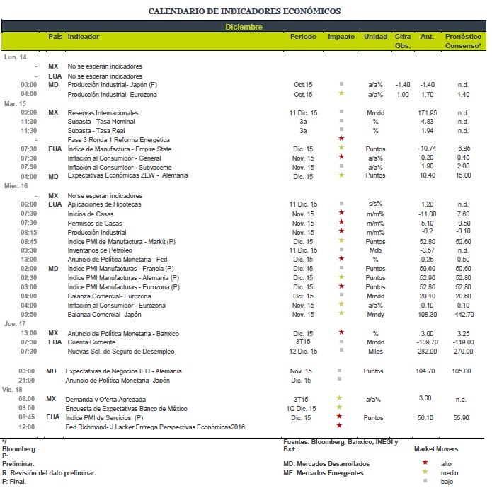 • Accionario: Los mercados accionarios en EUA apuntan un retroceso, como consecuencia de la caída constante de los precios del petróleo hasta niveles de 35dpb y por la expectativa de que la Fed suba la tasa este miércoles.