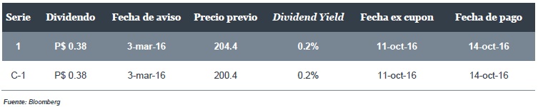 El pago del dividendo se hará en una sola exhibición el próximo viernes 14 de octubre, siendo el martes 11 la fecha ex cupón para el mismo y hoy el último día para adquirir los títulos para tener derecho al pago.