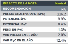 Como ya lo habíamos mencionado, Livepol anunció que durante su asamblea accionaria ordinaria celebrada el pasado 3 de marzo, se aprobó el pago de un dividendo ordinario a  P$0.38 para cada una de las acciones de la serie 1 y C-1. Livepol no forma parte de nuestras emisoras Favoritas. El PO’17 del consenso de P$226.2, representa un potencial del 9.9% vs. 8.4% del IPyC para el mismo periodo.