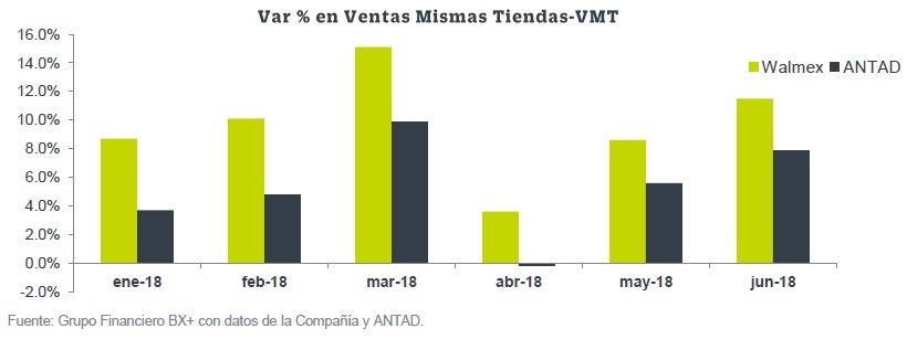 Durante el 2T18 la emisora llevó a cabo su primer evento Omnicanal: Hot Sales tanto en tiendas como vía electrónica, el cual implicó un crecimiento de 100% en ventas de e-commerce. Cabe destacar que la estrategia y el modelo de negocio de la emisora continúa siendo exitoso dado que consistentemente logra mejorar sus resultados por encima de las tendencias del mercado. En este caso, las VMT para el 2T18 superó en 430 pbs el registro de la ANTAD para el sector de Autoservicios.