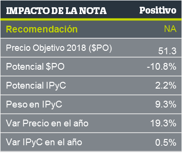 Walmex dio a conocer sus resultados financieros del 2T18, con un crecimiento en Ingresos y Ebitda de 8.1% y 8.3% respectivamente; ambas cifras en línea con la expectativa del consenso. Walmex no forma parte de nuestras Mejores Ideas; el PO’18 del consenso de P$51.3 implica una contracción de 10.8% vs. el potencial de 2.2% del IPyC para el mismo periodo.