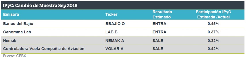 La fecha de referencia para el cambio de muestra de septiembre para el IPyC (Índice de Precios y Cotizaciones) será el último día hábil de julio de acuerdo a la metodología de la BMV (Bolsa Mexicana de Valores), por lo que a continuación mostramos los resultados obtenidos a dicha fecha, sustituyendo las estimaciones previas publicadas el lunes 3 de septiembre.