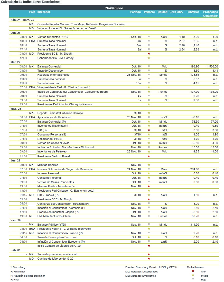 • Divisas: C. Urzúa apuntó que el Presupuesto 2019 tendrá un superávit primario del 1.0% del PIB, superior al estimado anterior de 0.8% del PIB. Tras depreciarse 1.0% ayer, el USDMXN descendió hasta un mínimo de $20.41 esta mañana. El real brasileño y se aprecia 1.2% contra el dólar.