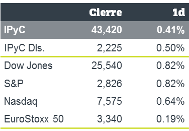 • Los principales índices accionarios terminaron la sesión en terreno positivo, reaccionando aún a los comentarios del Presidente de la Fed y la posibilidad de reaccionar con un recorte de tasas ante un debilitamiento de la economía. A esto se sumó un ambiente favorable hacia México, tras rumores de que podría evitar la imposición de aranceles por parte del gobierno de EUA.