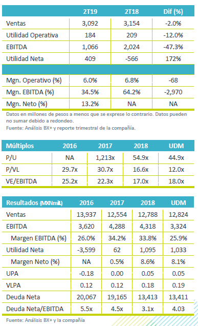 Reporte Negativo – Axtel tuvo un 2T19 difícil, con caídas en ingresos y retrocesos en datos operativos; mientras que los resultados netos se vieron impactados positivamente por operaciones discontinuadas. La compañía se encuentra en un proceso de reestructuración.; en los últimos trimestres ha vendido infraestructura y escindido activos no estratégicos, razón por la cual las cifras reportadas a/a presentan una base no comparable.