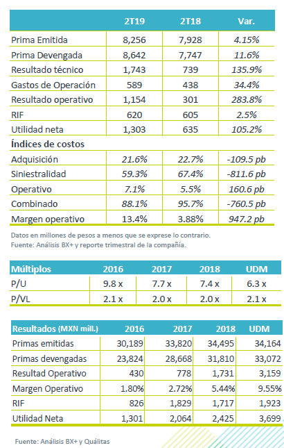 Significativo Aumento en Utilidad – Destacamos de forma positiva el aumento en rentabilidad de la compañía, derivado principalmente de la reducción en costos que se tradujo en un índice combinado de 88.1% , cifra significativamente menor al 95.7% observado en 2T18 y por debajo de la guía de la empresa (93-97%). Lo anterior contribuyó a un incremento en Utilidad Neta de 105% a/a