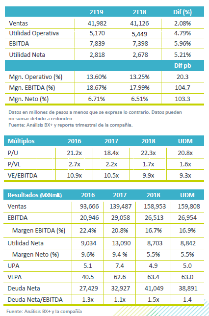 Crecimiento en ventas – Durante el 2T19, los ingresos totalizaron P$41,982 mn, un avance de 2.08% a/a, donde el alza de precios compensó la debilidad que presentó el volumen consolidado, el cual presentó un retroceso marginal de -0.5 a/a.