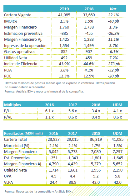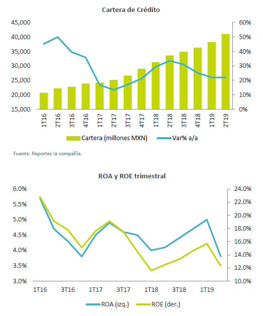 Buen desempeño de la cartera de crédito – La cartera de crédito mantuvo un buen ritmo de crecimiento (+22.1% a/a), en donde destacó el incremento en nómina (64.9% de la cartera) de 17.4% a/a, impulsado por el segmento de pensionados. Por su parte, Pymes (12.8% de la cartera) creció a una tasa de 82.4% a/a. Cabe decir que este crecimiento se logró disminuyendo la morosidad (0.5% 2T19 vs 0.8% 2T18). Lo anterior contribuyó a contrarrestar el débil incremento en Instacredit (11.4% de la cartera).