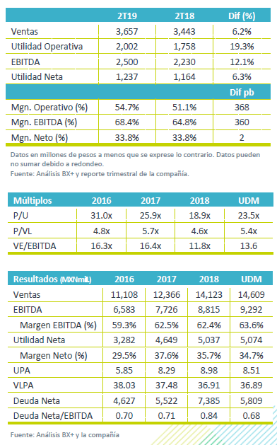 Incrementa la Utilidad Neta – A pesar del resultado operativo positivo, la utilidad neta creció a un menor ritmo. Lo anterior se explica por un incremento de casi 7.5 veces en los gastos financieros producto de mayores gastos por intereses y pérdidas cambiarias, efecto negativo que fue parcialmente compensado por una menor tasa impositiva (28.5% vs 31.1% en el 2T18).