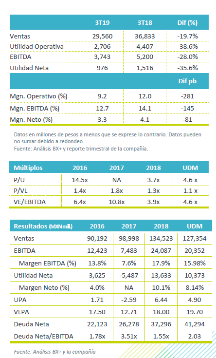 Presión durante el tercer trimestre – La empresa tuvo una disminución en el precio promedio del 18% a/a por menores precios de materias primas, lo que sumado a una baja del 4.77% a/a en volumen, ocasionaron una disminución en ingresos de 19.7% a/a, y una disminución de Ventas Netas acumuladas de 8% a/a .