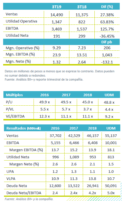 NIIF16 – En este trimestre la adopción de la NIIF 16 presentó un efecto positivo por P$31 mn en el estado de resultados, lo que representa el 13.4% de la utilidad neta. A nivel de EBITDA, el efecto es por P$1,550mn, un incremento de 1043 pb en el margen EBITDA A 23.9%. Lo anterior ubica el nivel de apalancamiento en 5.0x Deuda Neta/EBITDA .
