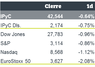 • En México, el IPyC finalizó a la baja. Las emisoras que registraron las mayores caídas fueron: GFNORTE (-2.5%), BSMX (-2.4%) y LAB (-2.2%).