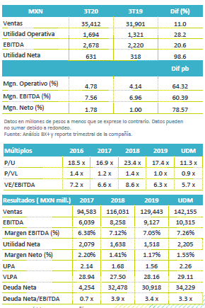 División Inmobiliaria – La división presentó un retroceso de 26.6% a/a, como resultado de las disminuciones temporales en los pagos de rentas durante el periodo. Cabe señalar que los resultados han mostrado una recuperación de forma secuencial en la medida que se eliminan las medidas de confinamiento.