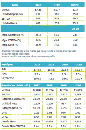 México con desempeño débil – Las ventas en México presentaron un retroceso de 0.7% a/a debido a una desaceleración en las compras por la pandemia, así como el efecto de una menor publicidad en TV abierta. A nivel operativo el cerro con un margen de 22.8%, una expansión de 380 pb, reflejando el mayor control en los costos y gastos que ha impulsado la compañía, así como menores inversiones en publicidad y marketing.