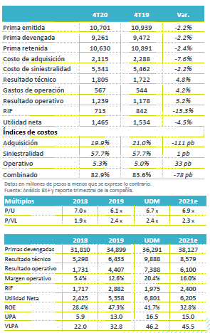 Continúan reduciendo la siniestralidad, aunque en menor medida – La menor movilidad continúa beneficiando a la aseguradora, con lo que el costo de siniestralidad disminuyó 2.2% a/a y en el año se redujo 10.0%. El beneficio en este rubro fue menor al observado en trimestres previos, ya que a finales de año se observó una mayor movilidad. En el año, el índice de siniestralidad cerró en 51.3%, cifra históricamente baja. Creemos que en 2021 deberíamos observar un aumento en este renglón, sobre todo después del primer trimestre.