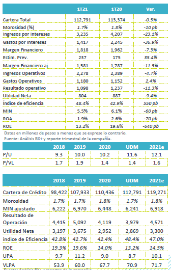 Reconoce más reservas – A pesar del fuerte incremento en reservas en 2020, en 1T21 el banco siguió generando provisiones (+35.4% a/a). Creemos que hacia adelante, el impacto de este renglón en las utilidades será menor.