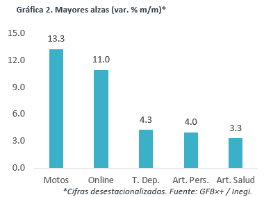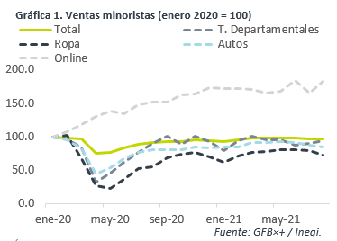 Nuevamente, crecieron 9/22 rubros. El rebrote del virus y su efecto en los patrones de gasto pudo estar detrás de la baja en ropa, calzado, combustibles y bienes de esparcimiento, y del alza en ventas en línea y cuidado de la salud; la baja en automóviles reflejó el bajo nivel de inventarios (disrupciones en producción). Pese al entorno, tiendas departamentales mostraron un sólido avance.