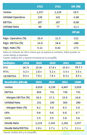 Utilidad Neta – La utilidad retrocedió 11.1% a/a, por un aumento en el costo financiero de 56% debido a perdidas cambiarias, y al mayor costo de la deuda por el alza en tasas de interés. Por su parte la tasa de impuestos fue de 38.6% frente al 37.6% en el 2T21.
