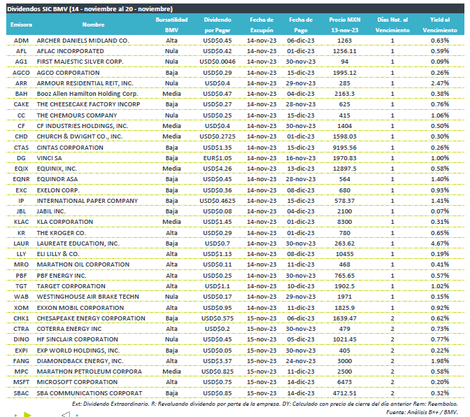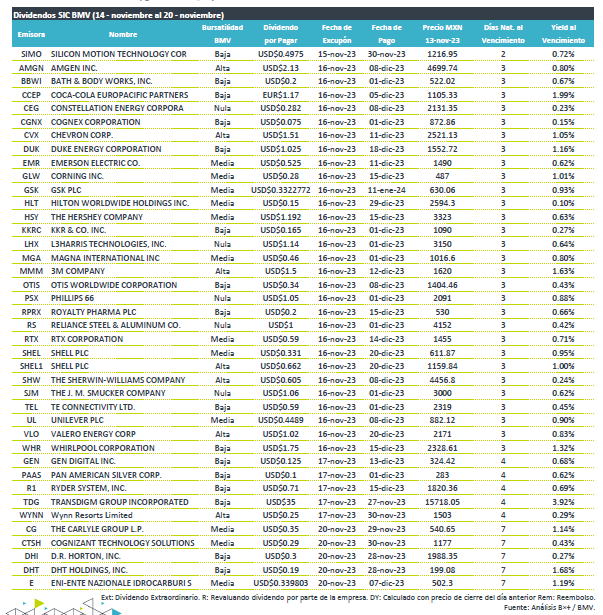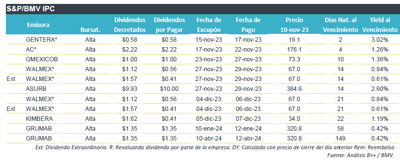 GENTERA “*” con un DY de 3.02% (P$0.58), ASUR “B” con un DY de 2.51% (P$10.0) y GMEXICOBcon un DY de 1.36% (P$1.00).