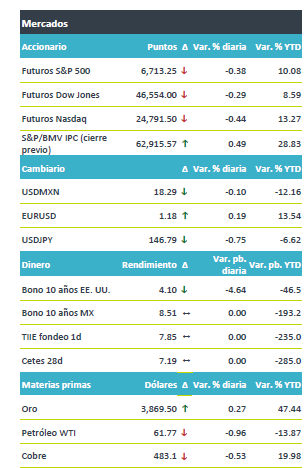 +Los futuros de los principales índices accionarios en EE.UU. caen, reaccionando al cierre de gobierno estadounidense y a las débiles cifras del empleo. En Europa, los mercados operan positivos (El Euro Stoxx 50 sube +0.37%), ante la preferencia de los inversionistas que se alejan de la incertidumbre en EE.UU., mientras que en Asia los índices cerraron mayoritariamente al alza, destacando el avanza de 0.87% del índice de Hong Kong. El rendimiento de los bonos a 10 años en EE.UU. baja 4.8 pb hasta 4.10%, ante el incremento de aversión al riesgo. El USDMXN se ubica en $18.29, apreciándose mientras el índice dólar cae 0.19%, perdiendo terreno frente a la mayoría de las divisas como el euro, la libra y el yen japonés. Respecto a materias primas, el precio de petróleo WTI retrocede 0.96%, mientras el oro alcanza un nuevo récord en 3,869.5 dpo ante la búsqueda de activos de refugio.