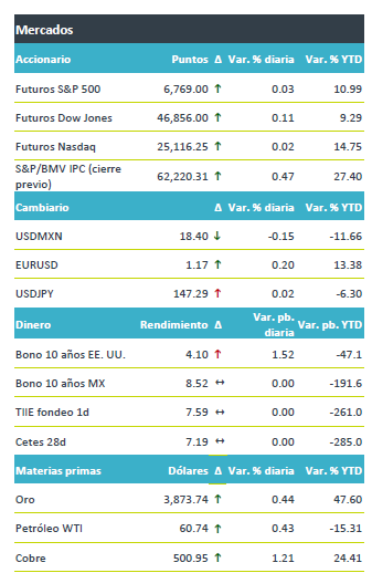 +Los futuros de los principales índices accionarios en EE.UU. operan marginalmente positivos, tratando de mantener los máximos alcanzados en la jornada previa, y buscando cerrar la semana al alza. En Europa, los mercados presentan movimientos mayormente positivos, el FTSE 100 sube 0.5% y registró máximos históricos, mientras que en China permanecen cerrados por feriados, en Japón los índices cerraron positivos. El rendimiento de los bonos a 10 años en EE.UU. rebota 1.5 pb hasta 4.10%, en línea con el bono a 2 años que avanza hasta 3.56%. El USDMXN se ubica en $18.40, apreciándose ya que el índice dólar pierde 0.10% ante divisas como el euro y la libra. Respecto a materias primas, el precio de petróleo WTI sube 0.43%, pero se encamina a su peor semana desde junio, pendiente de la reunión de la OPEP+ el fin de semana. Por último, el oro busca cerrar su séptima semana de avances.