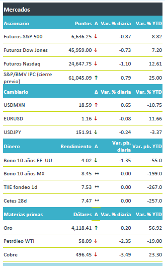 +Anticipamos una jornada volátil, ante el regreso de tensiones comerciales entre China y los EE. UU. Las disputas se intensificaron esta mañana después de que China impusiera restricciones a cinco subsidiaras en Corea del Sur de empresas de transporte marítimo ligadas a los EE. UU. Por otro lado, prevemos que se asimilen los resultados corporativos al 3T25, donde el consenso estima crecimiento en utilidades para el S&P 500 de 8.8% a/a, y hoy destacaron los buenos reportes del sector bancario. Finalmente, será relevante el discurso del presidente del Fed programado para este día.