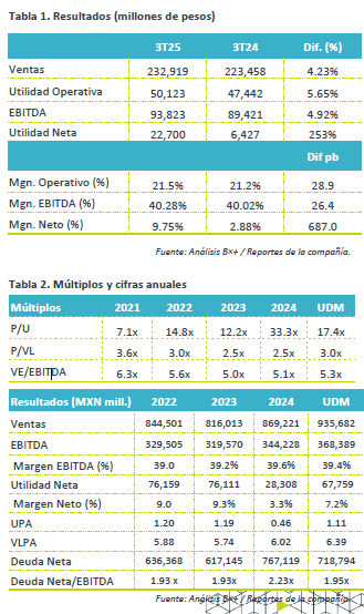 Valuación. El Flujo libre de efectivo cubrió MXN$28.6 miles millones en distribuciones a accionistas incluyendo una recompra de acciones y una reducción de deuda de MNX$15.7 miles de millones, con lo anterior el ratio de apalancamiento presentó una mejora, pasando de 2.23x en 2024 a 1.95x.Recalcamos que la compañía incrementó su ROE de 7.6% al final del 2024 a 17.4% al cierre del 3T25. En múltiplos presenta un descuento de 1.0% en VE/EBITDA.