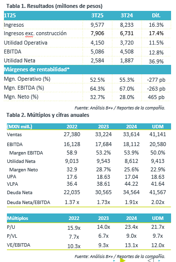 Incremento en ingresos. En el 3T25, los ingresos de GAP crecieron 16.3% a/a, gracias a la recuperación del tráfico de pasajeros y por el incremento en el ingreso de TUA debido al aumento en las tarifas aeroportuarias, con lo anterior los ingresos aeronáuticos subieron 18.3% a/a. Los ingresos no aeronáutico subieron 15.6% a/a gracias a que continúa la consolidación de un negocio de carga y almacén fiscal. También se presentó un incremento de 4.7% a/a en negocios operados por terceros, gracias a la apertura de nuevos espacios comerciales y renegociación de contratos.