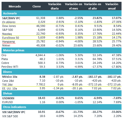 +El precio del petróleo (WTI) subió 3.5% y finalizó en $59.3 dpb, el oro presentó un decremento de 1.0% terminando en un precio de $4,044.4 dpb.