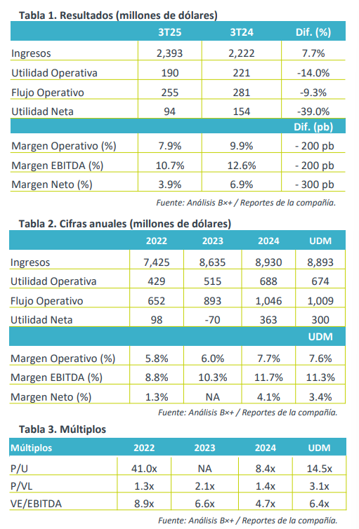 Rentabilidad. Durante el 3T25, la utilidad operativa de Sigma se contrajo 14.0% a/a y el flujo operativo disminuyó 9.3% a/a, debido a las presiones en materias primas como jamón (+10.0% y gripe aviar en EE.UU. que impactó el precio en pavo y pollo. Así, los costos aumentaron 11.2% a/a y los gastos operativos incrementaron 6.6% a/a en el 3T25. De esta forma, los márgenes se presionaron 200 pb. Por último, la utilidad neta se contrajo 39.0% y el margen neto disminuyó 300 pb ante las presiones operativas y mayores gastos financieros.