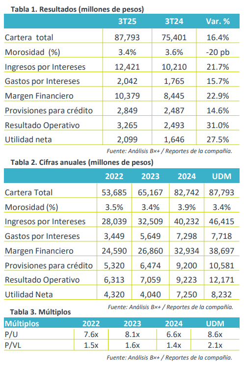 Indicadores relevantes. El costo de riesgo para el 3T25 fue de 13.3%, el Margen de Interés Neto (MIN) se ubicó en 42.2%, el ROE de la parte controladora fue de 25.5%, el índice de cobertura fue de 236.2% y un índice de capitalización de 31.7%.