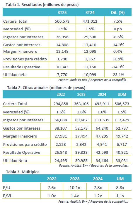 Indicadores relevantes. Se mantiene la calidad general de cartera, el índice de morosidad se mantuvo en 1.5% al cierre del 3T25, sin cambios en su comparativo anual. El índice de capitalización del grupo se ubicó en 23.4%. El ROAE se ubicó en 12.3% y un ROAA de 4.0% en últimos 12 meses.