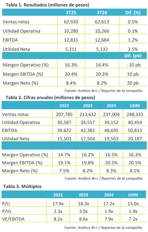 Resiliencia en ventas. Las ventas netas aumentaron marginalmente 0.5% a/a en el 3T25, (3.8% sin efecto de tipo de cambio), manteniendo la tendencia e hilando su séptimo trimestre al alza, y ante la contracción del volumen, el incremento de precios en las regiones favoreció el avance de las ventas. Por región, observamos avances en Estados Unidos (+4.2%), y en México (+2.8%), que compensaron la caída en ventas en Sudamérica (-13.6%).