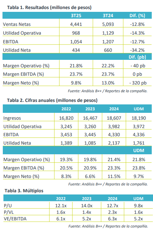 Reporte débil. La empresa presentó un 3T25 débil, con contracción en ventas ante la debilidad del consumo en México y afectaciones EE.UU. del mercado hispano. La empresa no presenta presiones en márgenes que generen preocupación, sin embargo, las pérdidas cambiarias impactaron el resultado neto.