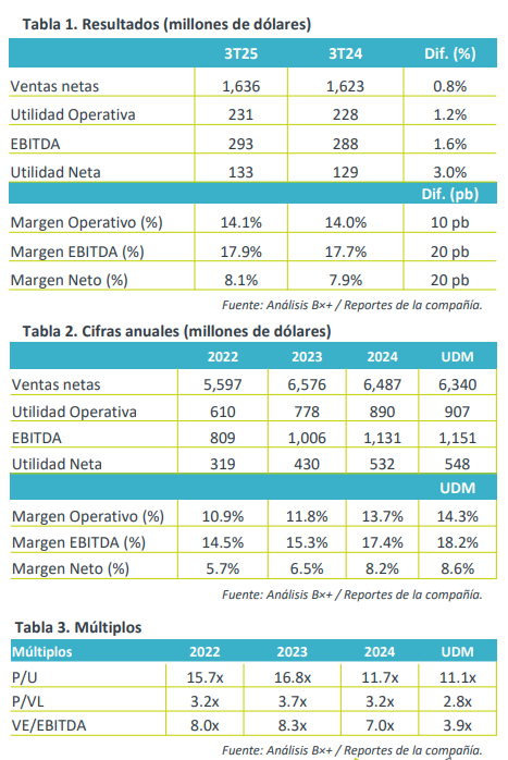 Beneficio cambiario. Las ventas netas crecieron 0.8% a/a en el 3T25, ante el incremento en volumen y un efecto cambiario positivo para las ventas en México. Por regiones, se reportaron aumentos de ventas en México (+0.1%), Europa (+14.9%), Asia y Oceanía (+6.5%) y Centroamérica (+2.1%), mitigando la caída de 4.7% a/a en EE.UU., que representa 53% de las ventas totales.