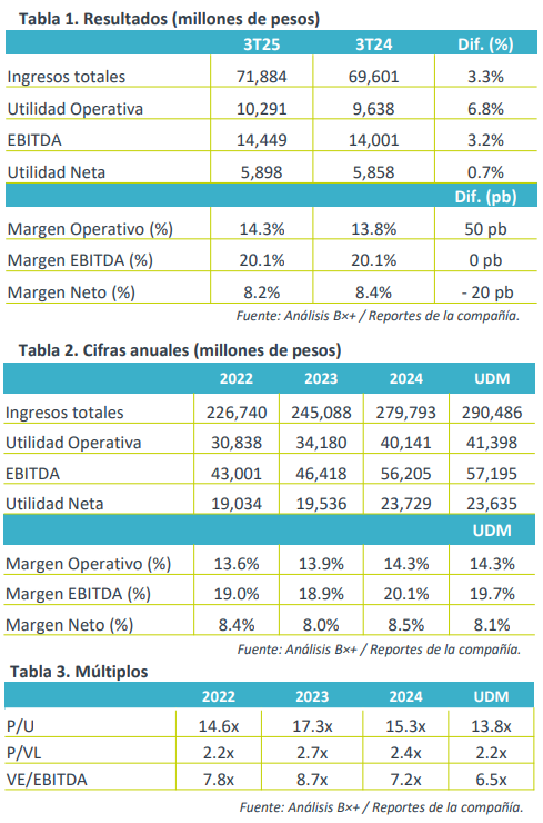• Utilidad supera expectativas. Coca – Colca Femsa reportó utilidades que superaron las expectativas, ya que se esperaba una contracción en el indicador, no obstante, la eficiencia operativa y resiliente desempeño en ventas permitió un favorable 3T25.