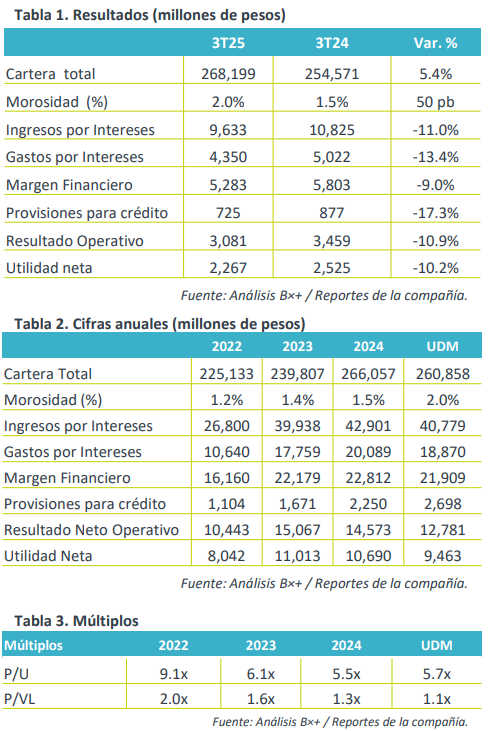Indicadores relevantes. Al cierre del 3T25, el índice de morosidad aumentó 50 pb a 2.0%. El MIN de la cartera total se ubicó en 5.9%, el ROAE fue de 19.7%. Por último, el banco reportó un índice de capitalización de 15.9% al mes de septiembre.