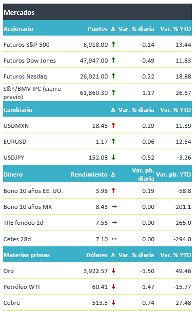 +Los futuros de los índices accionarios estadounidenses operan de forma positiva, luego de dos jornadas al alza, asimilando los resultados corporativos y a la espera de los reportes de empresas de tecnología y relacionadas con la inteligencia artificial (IA). De las 143 empresas del S&P 500 que han presentado resultados, el 87% ha superado las estimaciones. Los índices en Asia cerraron con retrocesos, con el NIKKEI japonés retrocediendo 0.6%. En materias primas, el crudo retrocede ante la probabilidad de un aumento en la producción por parte de la OPEP; el oro decrece 1.5%, conforme aumenta el optimismo en materia comercial. El rendimiento a 10 años de los bonos del tesoro presenta pocos cambios a la espera de que mañana el Fed anuncie otra reducción en tasas de interés. En este contexto, el tipo de cambio se deprecia en el margen, oscilando durante la madrugada entre $18.35-18.44.