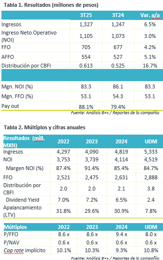 - Crecimiento en ingresos. En el 3T25 Fibra Macquarie presentó un reporte con avances y mejoras secuenciales en márgenes. Las variaciones fueron +6.5% en ingresos y +4.2% en FFO