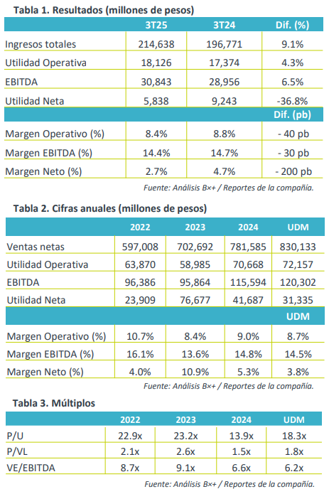 Efectivo y Deuda. La compañía terminó septiembre con una posición de efectivo de $114,046 mdp (excluyendo KOF), mientras que reporta una razón de deuda neta sobre EBITDA de 0.91x, ya que su deuda neta es de $62,957 mdp al 3T25. La inversión en activo fijo fue de $13,128 mdp, 6.1% de los ingresos totales, y un incremento de 8.2% a/a.