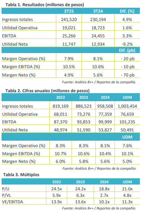 Rentabilidad. La utilidad neta terminó el 3T25 con una contracción de 9.2%, debido a las presiones operativas que fueron profundizadas por un incremento de 65.7% en gastos financieros y de +10.0% en impuestos. Por lo anterior, el margen neto disminuyó de 5.6% a 4.9% en el trimestre.