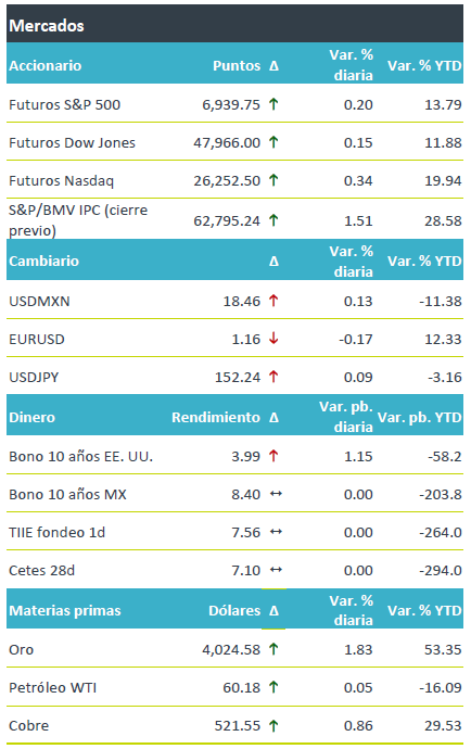 +Los futuros de los principales índices accionarios en los EE. UU. continúan con la racha positiva de la jornada previa, marcando máximos históricos, apoyados por el sector tecnológico. En Europa, los mercados siguen el optimismo en los EE. UU. (Euro Stoxx 50 +0.4%), mientras que en Asia los índices cerraron positivos, con el ánimo favorable en la víspera de la reunión Trump – Xi. El rendimiento de los bonos a 10 años en EE.UU. sube moderadamente, ante el mayor apetito por riesgo, y con el mercado ya descontando el recorte en tasas por parte del Fed. El USDMXN se ubica en $18.46, mientras el índice dólar recupera fuerza y sube 0.3% ante divisas como el euro, la libra y el yen japonés. Respecto a materias primas, el precio de petróleo WTI opera marginal, mientras el oro recupera el nivel de 4,024 dólares por onza.