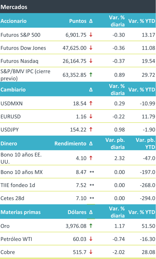 +Los futuros de los principales índices accionarios en EE.UU. iniciaron a la baja debido a una reunión con saldos positivos, pero no extraordinarios, entre Beijing y Washington. Las señales mixtas en los reportes trimestrales de tres de las “Siete Magníficas” (Alpha mejor que lo esperado, Meta con dudas sobre inversión en IA y Microsoft ligeramente peor que expectativas), junto con el anuncio del Fed de que recortes adicionales no están garantizados, contribuyeron a la baja. Los mercados en Europa operan de forma negativa, el Euro Stoxx 50 cae 0.59%, mientras que en Asia en Nikkei cerró al alza 0.04%. El rendimiento de los bonos a 10 años en EE.UU. sube, luego del anuncio cauteloso del Fed. El USDMXN se coloca en 18.54%, por aversión al riesgo. En materias primas el crudo cae 0.47% luego de haber avanzado por sanciones a petroleras rusas en días pasados y el oro avanza afianzando su posición de activo de refugio.