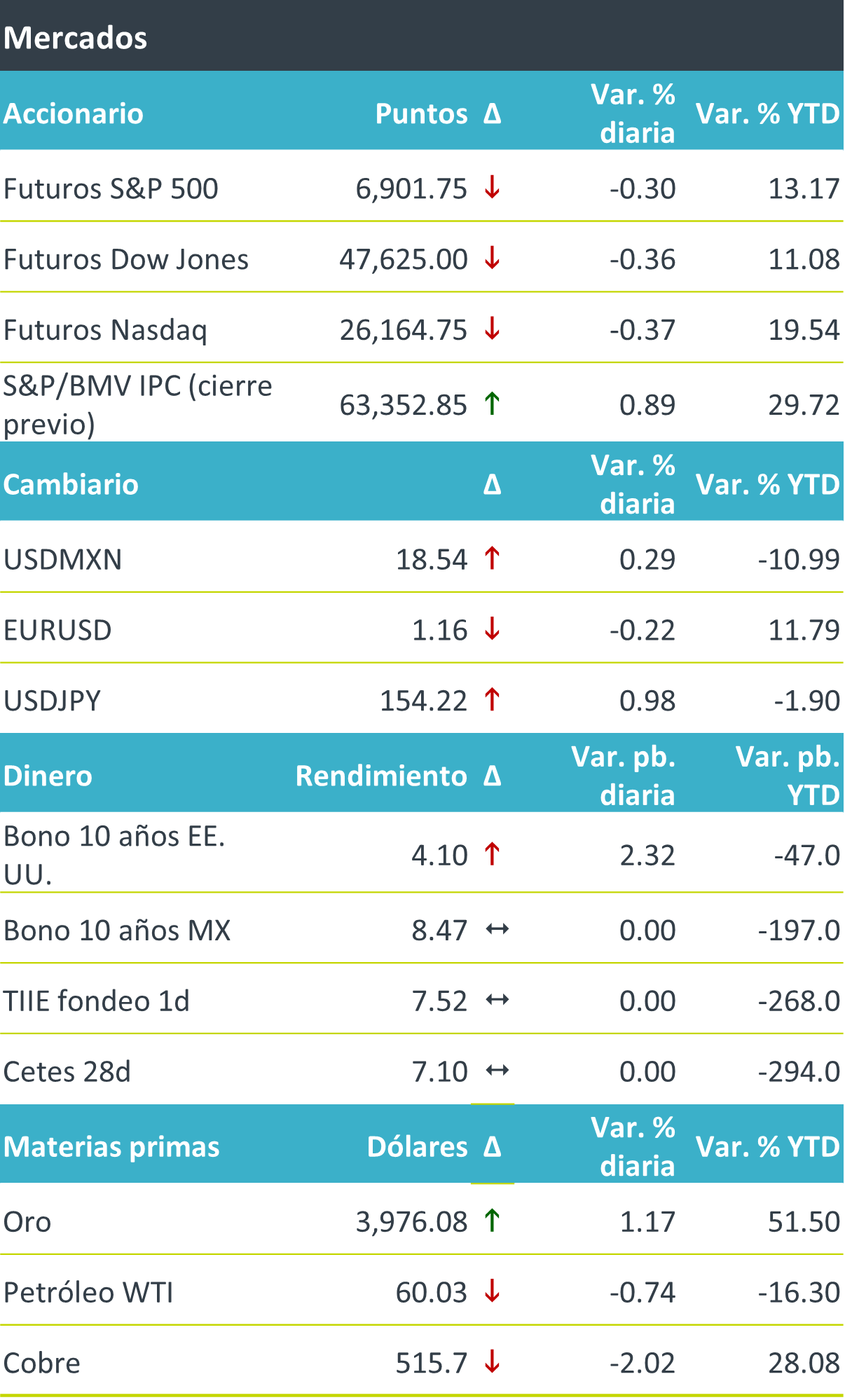 +Los futuros de los principales índices accionarios en EE.UU. iniciaron a la baja debido a una reunión con saldos positivos, pero no extraordinarios, entre Beijing y Washington. Las señales mixtas en los reportes trimestrales de tres de las “Siete Magníficas” (Alpha mejor que lo esperado, Meta con dudas sobre inversión en IA y Microsoft ligeramente peor que expectativas), junto con el anuncio del Fed de que recortes adicionales no están garantizados, contribuyeron a la baja. Los mercados en Europa operan de forma negativa, el Euro Stoxx 50 cae 0.59%, mientras que en Asia en Nikkei cerró al alza 0.04%. El rendimiento de los bonos a 10 años en EE.UU. sube, luego del anuncio cauteloso del Fed. El USDMXN se coloca en 18.54%, por aversión al riesgo. En materias primas el crudo cae 0.47% luego de haber avanzado por sanciones a petroleras rusas en días pasados y el oro avanza afianzando su posición de activo de refugio.