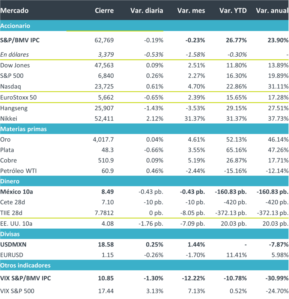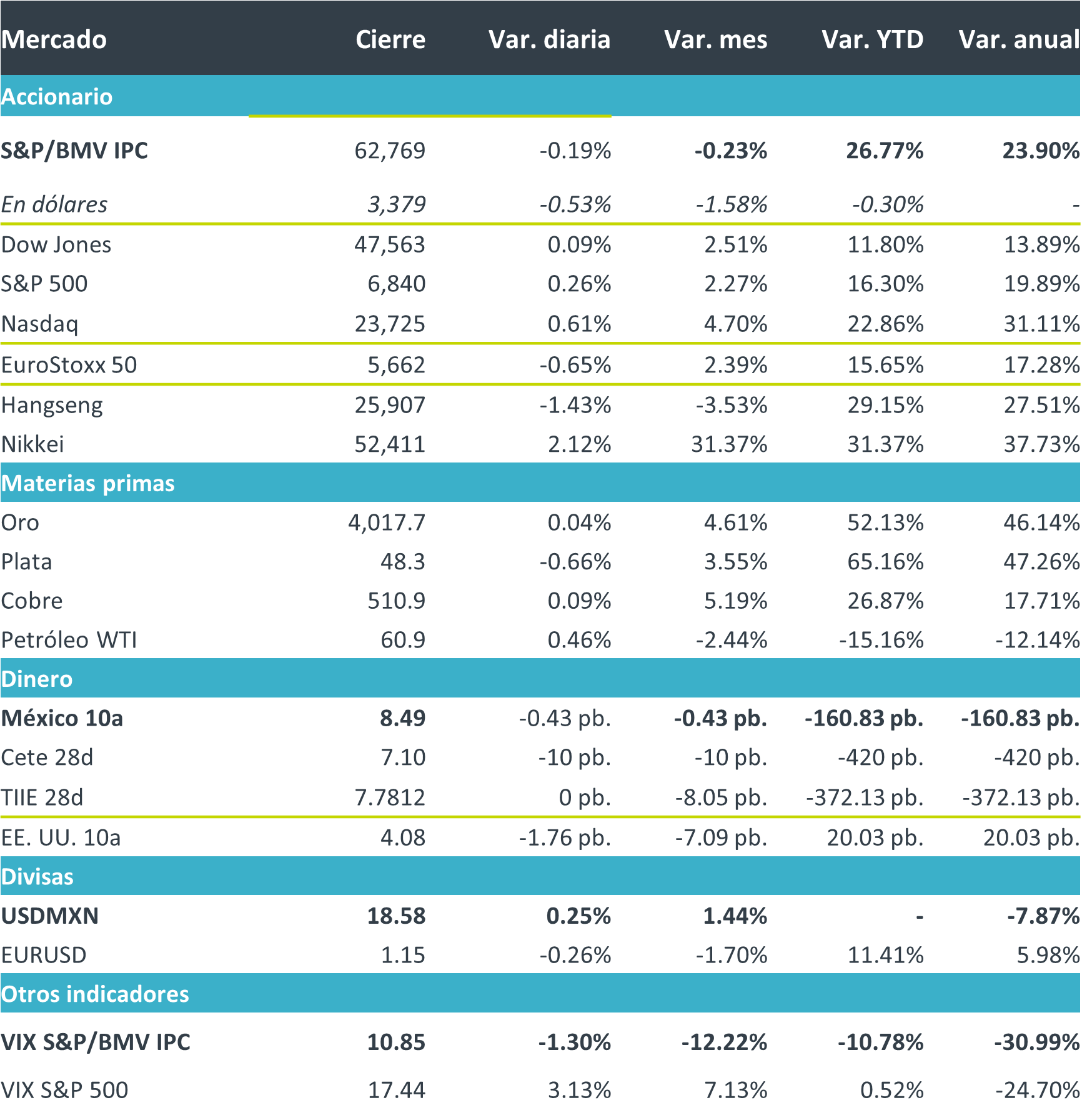 Durante la próxima semana, el índice PMI manufacturero para Europa, Alemania, Estados Unidos (e ISM), México y China (RatingDog PMI); anuncio de política monetaria por los Bancos Centrales de México e Inglaterra; balanza comercial de China y EE. UU.; tasa de desempleo y nóminas no agrícolas en Estados Unidos y datos de inflación de octubre para México.