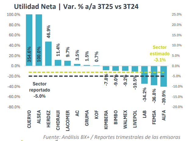 El sector consumo presentó una contracción de 5.0% a/a en utilidades netas, una caída más profunda que la estimada por el consenso de 3.1% a/a, pero más moderada que en el 2T25.
